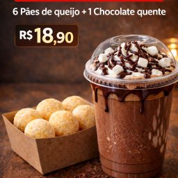 6 pães de queijo quentinhos e macios acompanhados de chocolate quente cremoso 330ml, preparado com l...