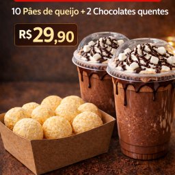 10 pães de queijo quentinhos acompanhados de 2 chocolates quentes cremosos 330ml, feitos com leite e...