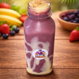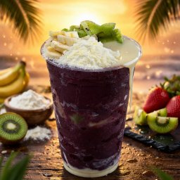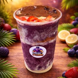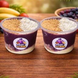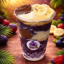 Açai cremoso, leite ninho, leite condesado uma fruta opcional (banana ou morango)