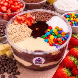 Açai cremoso, leite ninho, leite condesado,morango,banana,sonho de valsa,paçoca e granola