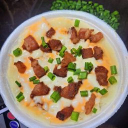 Batata recheada com strogonoff de frango, requeijão cremoso e mussarela. Finalizado com bacon e cebo...