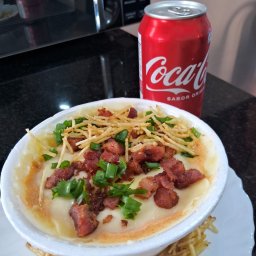Batata recheada com calabresa, bacon, creme cheddar e mussarela. Finalizado com bacon e cebolinha. A...
