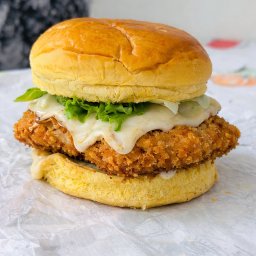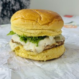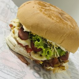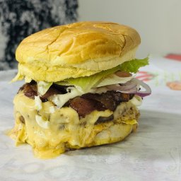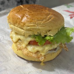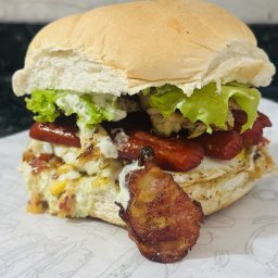 Pão brioche, hambúrguer 100g, queijo mussarela, 2 filés de frango, alface, tomate e maionese da casa...