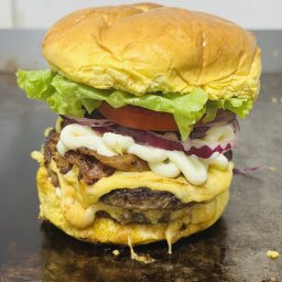 Pão brioche, 2 hambúrgueres gourmet, bacon, queijo prato, cebola roxa e maionese da casa.
