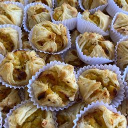 Pão Folhado recheado com creme de camarões e cobertura de nuts e uva passas caramelizadas.