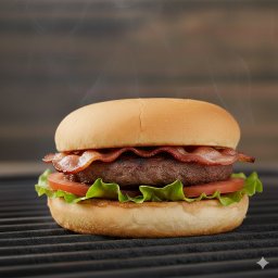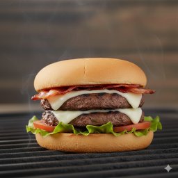 Pão, 2 blends bovinos assados de 120g cada, queijo mussarela derretido, bacon crocante, alface e tom...