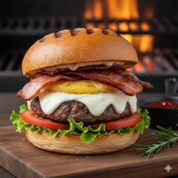Pão, blend bovino artesanal 120g, queijo mussarela derretido, bacon crocante, fatia de abacaxi caram...