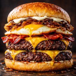 Pão, 2 hambúrgueres, queijo, bacon, ovo, cebola caramelizada maionese