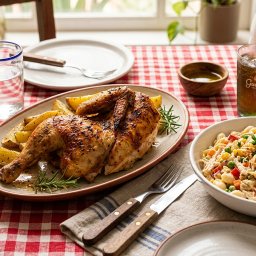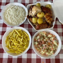 Frango inteiro, arroz , batata frita e macarronese