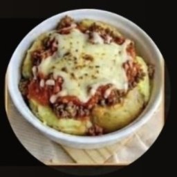 Batata recheada no pote com carne moída, acompanhada de molho rosé, mussarela e requeijão. 500 g