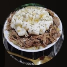 Batata recheada no pote com costela desfiada, acompanhada de requeijão e mussarela. 500 g