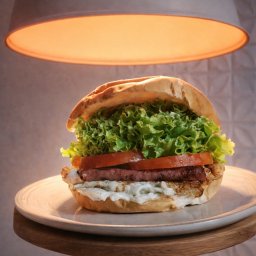Pão, hambúrguer, presunto, queijo, ovo, bacon,alface, tomate e maionese.