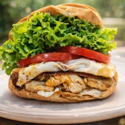 Pão, filezinho sassami, presunto, queijo, ovo, alface, tomate e maionese.