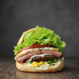 Pão, hambúrguer, presunto, queijo, ovo, milho, ervilha, alface, tomate e maionese.