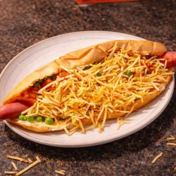 Pão, salsicha, milho, ervilha, queijo chapeado, molho de tomate, mostarda, catchup, batata palha e n...