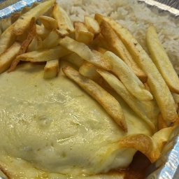ARROZ BRANCO, MOLHO VERMELHO, MUSSARELA, FILÉ DE FRANGO EMPANADO E BATATA FRITA.