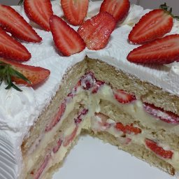 Fatia de Bolo de Ninho com morango, Massa de baunilha macia, recheada com creme de leite Ninho Origi...