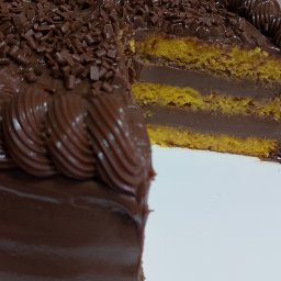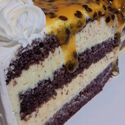 Fatia de Bolo de Maracujá, Massa de chocolate feita com cacau 50%, recheada com creme de maracujá e ...