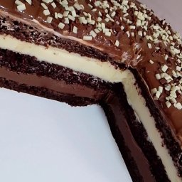 Fatia de bolo dois amores, Massa de chocolate feita com cacau 50%, recheada com brigadeiro gourmet f...