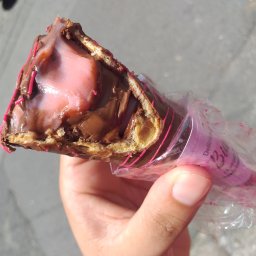 Cone de Creme de morango com Nutella, Casquinha crocante banhada em chocolate blend, recheada com cr...