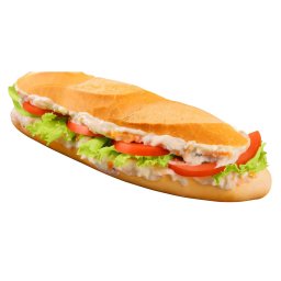 Pão baguete, Patê de Frango, Mussarela, Alface e Tomate