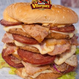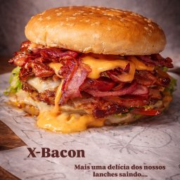 Carne, queijo, presunto, bacon, ovo, calabresa, tomate, cebola roxa, alface, batata palha, molho Bil...