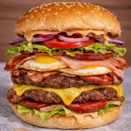 2 carnes, queijo cheddar, cebola caramelizada, alface, tomate e molho Billy Jack
