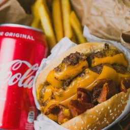 4 carnes suculentos, 4 queijos derretidos, calabresa fatiado e bacon, molho Billy Jack, ketchup, mai...