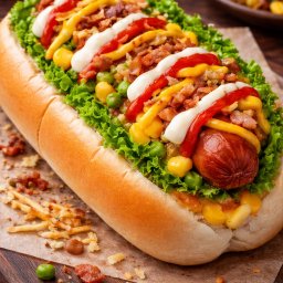 Pão cachorro quente, molho, salsicha, bacon, milho, ervilha, batata palha, ketchup, mostarda, maione...