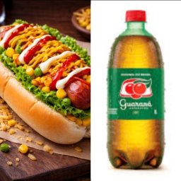 Pão cachorro quente, molho, 2 salsichas, bacon, milho, ervilha, batata palha, ketchup, mostarda, mai...