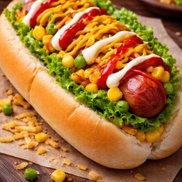 Pão cachorro quente, molho, salsicha, milho, ervilha, batata palha, ketchup, mostarda, maionese e al...