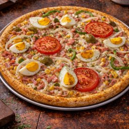 Molho de tomate, mussarela, frango, presunto, ovo, milho, cebola, pimentão, tomate, azeitona e oréga...