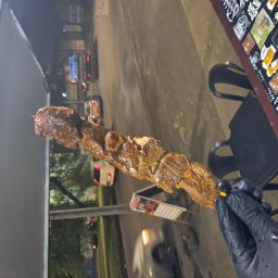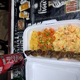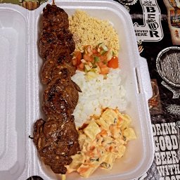 Um espetinho de carne com acompanhamento. Arroz, Maionese, vinagrete e Farofa