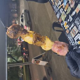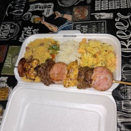 Um espetinhoMisto com acompanhamento. Arroz, Maionese, vinagrete e Farofa