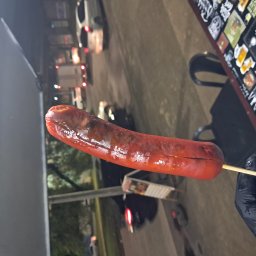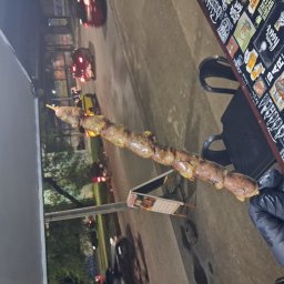 Um espetinho de Linguiça toscana com acompanhamento. Arroz, Maionese, vinagrete e Farofa