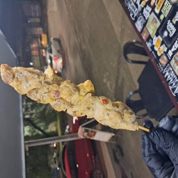 Um espetinhode frango com acompanhamento. Arroz, Maionese, vinagrete e Farofa
