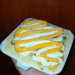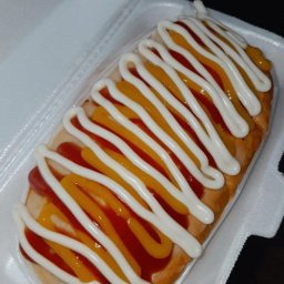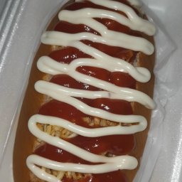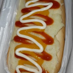 Pão, 2 salsichas, molho especial, milho, salada de repolho, batata palha, purê de batatas, ketchup, ...
