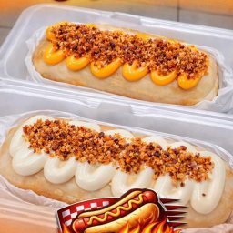 Pão, salsicha, milho, batata palha, bacon em cubos, purê de batatas, requeijão scala e farofa de bac...