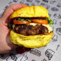Hambúrguer artesanal de 100g coberto por queijo, maionese temperada, tomate e alface