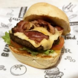 Hambúrguer artesanal de 100g coberto por queijo, bacon, tomate e alface