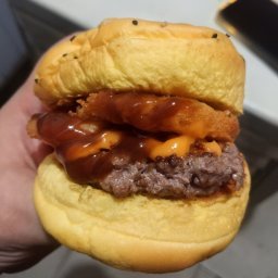 Hambúrguer artesanal de 100g, cheddar, cebola empanada e molho barbecue