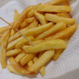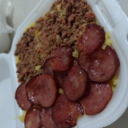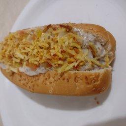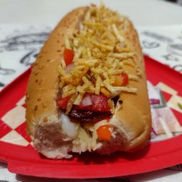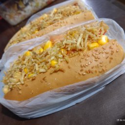 Salsicha, carne moída, frango, vinagrete, milho e ervilha e batata palha