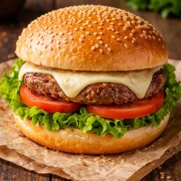 Pão de hambúrguer, hambúrguer artesanal, mussarela, alface, tomate e maionese caseira.