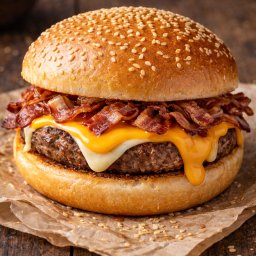 Pão de hambúrguer com gergelim, hambúrguer de picanha, mussarela, bacon, cheddar e maionese caseira.