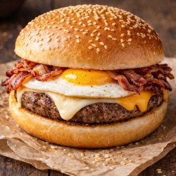 Pão de hambúrguer com gergelim, hambúrguer de picanha, mussarela, ovo, bacon e maionese caseira.