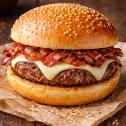 Pão de hambúrguer, hambúrguer artesanal, mussarela, bacon, tomate e maionese caseira.