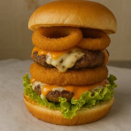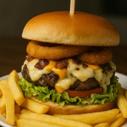 Pão de brioche, dois hambúrgueres, cebola onion, queijo mussarela duplo, cheddar, bacon, alface, vin...
