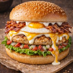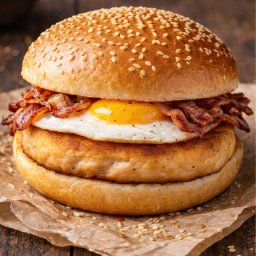 Pão de hambúrguer com gergelim, hambúrguer de frango, mussarela, ovo, bacon e maionese caseira.