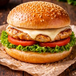 Pão de hambúrguer com gergelim, hambúrguer de frango, mussarela, alface, tomate e maionese caseira.