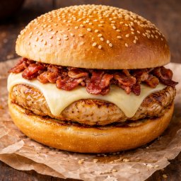 Pão de hambúrguer com gergelim, hambúrguer de frango, mussarela, bacon e maionese caseira.